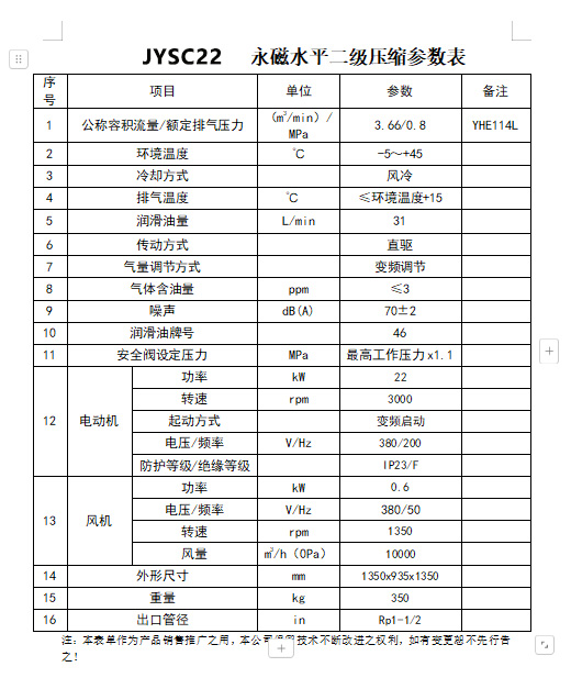 產(chǎn)品名稱:22kW 水平雙級直連永磁變頻空壓機 JYSC22