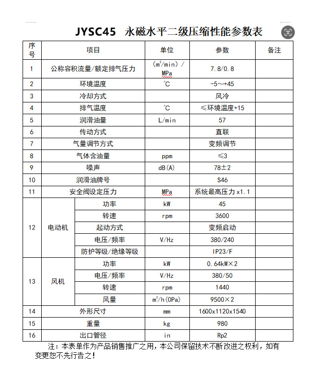 產品名稱:45kW 水平雙級直連永磁變頻空壓機 JYSC45